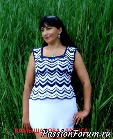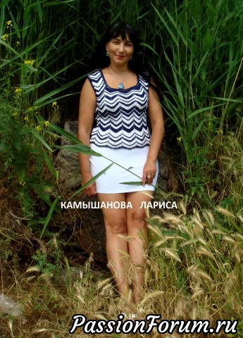 Лариса, отличный топ получился. Ничего лишнего, рисунок волн создаёт образ. Я давно слежу за Вашим мастерством. Ещё в Одноклассниках обратила внимание на Ваш стиль в вязании.Желаю дальнейших творческих успехов!