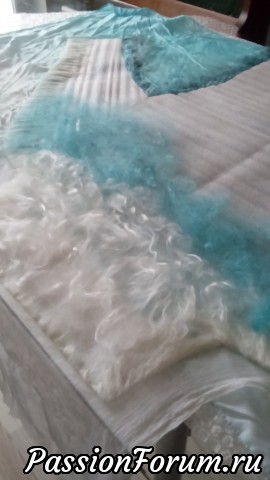 шерсть меринос 18 мкр в гребенной ленте четырех цветов:белая,голубая,серая,бежево-коричневая,шелк понже кусочек,волокна вискозы на подкладку,мыло,вода,перчатки,сетка,выкройка,пупырка,шлиф.машинка.