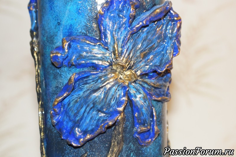 Спасибо.Ваза стеклянная-сначала декорирую ее(грунт, акрил, лак), имитация лазурита. Затем выкладывала цветок, после того как подсохло, красила акриловой краской.