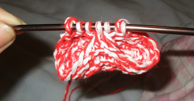 17 ряд(на спице-7 петель)-провязать 3 петли-лицевыми; подхватить крючком среднюю петлю наборного ряда за обе стенки и навесить её на левую спицу. Затем провязть её 2 вместе лицевой со следующей петлёй.3 лицевые