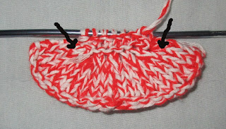 9 ряд-вытянуть дополн. петлю из кромочной петли низлежащего ряда и надеть её на левую спицу.Провязать все 8 петель-лицевыми. В конце ряда вытянуть допол. петлю из краевой петли низлежащего ряда и надет; на лев.спицу, затем провязать её девятой, лицевой петлёй. (Петли вытягивать там, где показано стрелками).