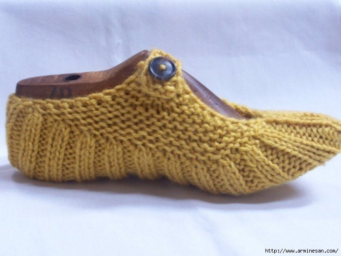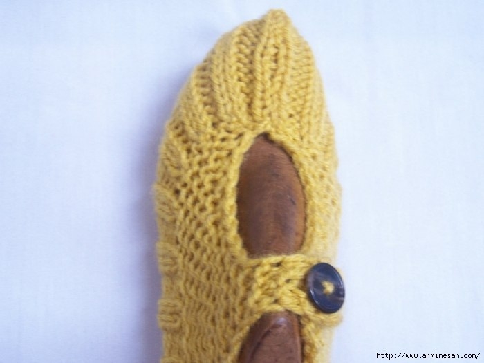 Завершительный этап сшиваем тапочек:сложите в двое связанное полотно и зашейте пятку и мысок тапочка,участки вязанные резинкой.Пришейте красивую пуговку,тапочек готов.