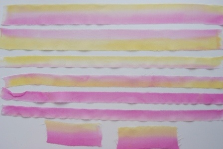 Думаю, можно покрасить ленточки поперёк, а потом порезать на лепестки. Можно тонировать светлее-темнее (например, яркая сердцевина и чуть тонированный краешек.