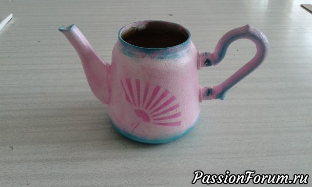 Согласитесь, розовый чайник — не смотрится. Грубоват и не аакуратен переход на синий цвет (может и цвет не тот). Как-то надо было сделать этот переход мягче, от более плотного к разреженному. А то будто неаккуратно зеленкой намазали.