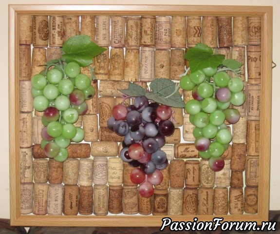 По случаю у меня появилось огромное количество пробок от вин (подарил знакомый парень- бармен, хотел отнести на помойку, а я выпросила, потому что обожаю пробку). Постепенно почти все пробки ушли в дело. Все работы называются "Превращение", т.к. символизируют собой превращение винограда в вино, которое разливается по бутылкам и закупоривается пробками.