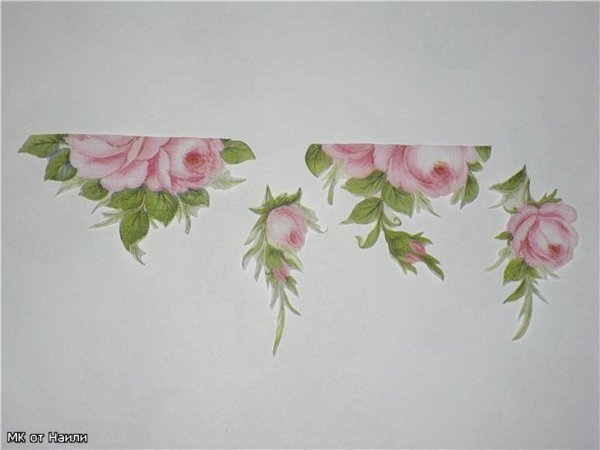 2. Пока высыхает красочка, вырезаем мотивы и делим-разрезаем их примерно вот так. Затем клеим, используя ПВА на вазу. Примечания – в зависимости от мотива, он может неровно ложиться по ободку см.