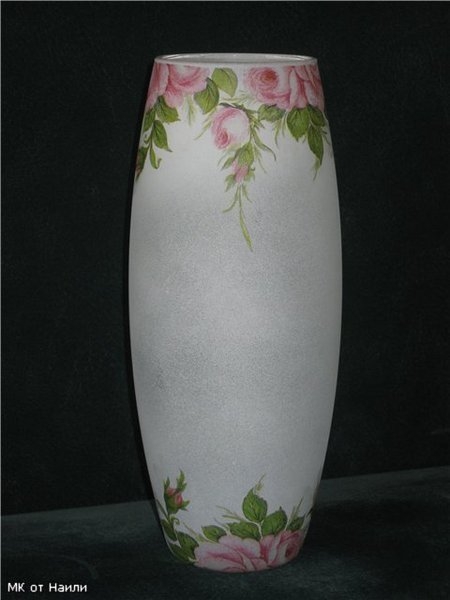 1. Наносим аэрозольную белую краску на вазу, таким образом – понасыщеннее вверху (по ободку) и внизу также, то есть там где предположительно будут мотивы салфетки. И плавно ведём красочку по всей вазе, но уже очень тонким слоем, как-бы слегка припорошить надо. Именно на этой вазе я не пожалела краски и прошлась слишком густо по всей (это считайте ошибкой ) я специально вложила салфетку, чтобы видно было насколько она покрылась краской. А лучше бы чтобы была полу-прозрачной, воздушной!!