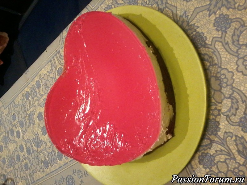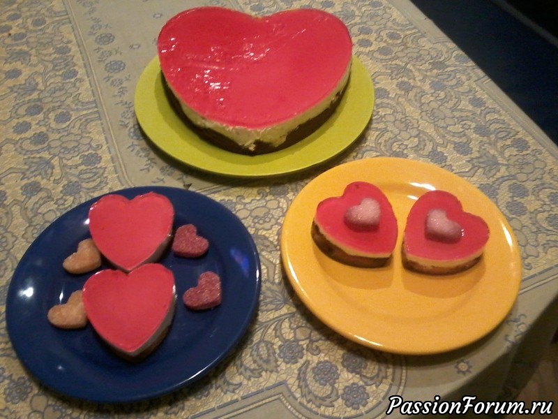 Пироженки. Это бисквит. Сверху творожный крем-желе, ну и вишневое желе. И сахарные сердечки в блюдечке.
