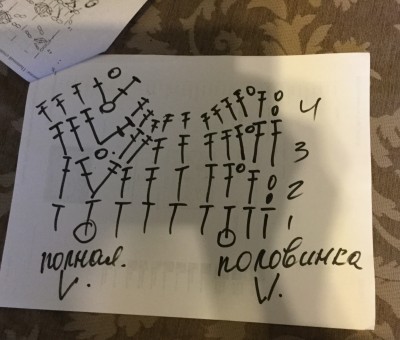 Начинаем с кокетки ,вяжется сверху вниз.Набираем цепочку из 44 ВП+1(петля подъема).Я на листочке пропустила расшифровку 45 ,что это 44+1ВП подъёма....упс извините будут корректировки,не была внимательна к деталям,постараюсь обратить ваше внимание на несоответствия
