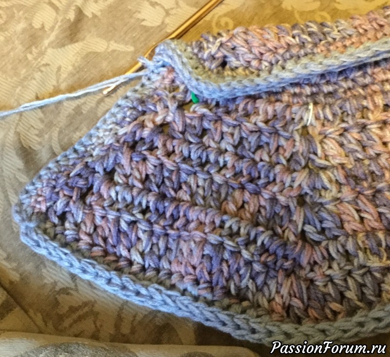 Теперь по краю линии реглана,которая как вы увидите не очень ровная из за ВП подъёма и столбика с накидом связала один ряд столбиком без накида,делаю это что бы выравнять край одинаковым цветом с полотном.Когда обвязываем другим цветом края на полотне видны стежки контрастного цвета и получаеться не очень красиво ,если обвязать столбиком без накида основным цветом ,т.е. опустить высоту последнего ряда этот момент выравнивает линию ряда другого цвета обвязки.Крючок взяла поменьше ,но вязала свободно.