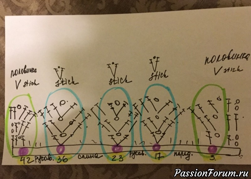Таким образом у нас определены линии реглана,места с марками где будем прибавлять с помощью V столбика с воздушной петлей. .