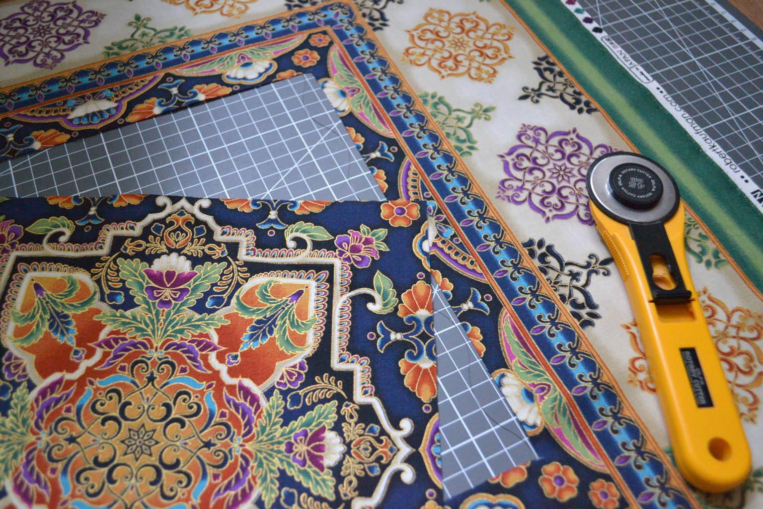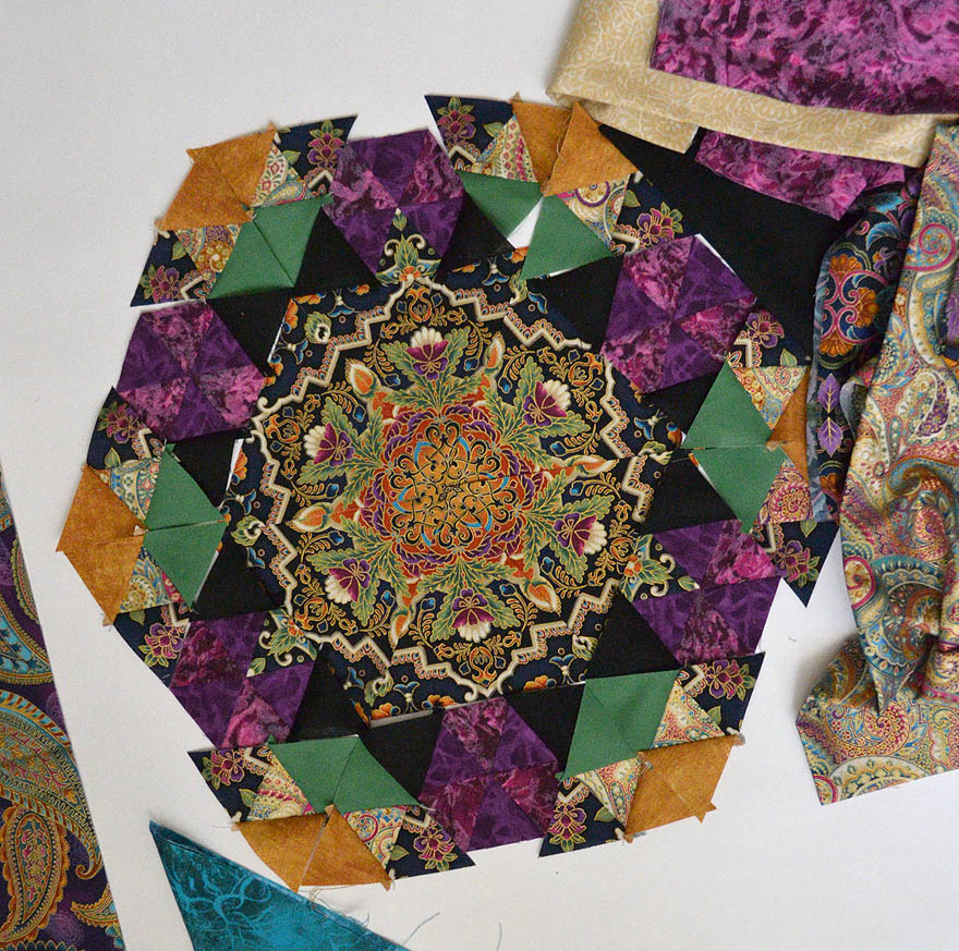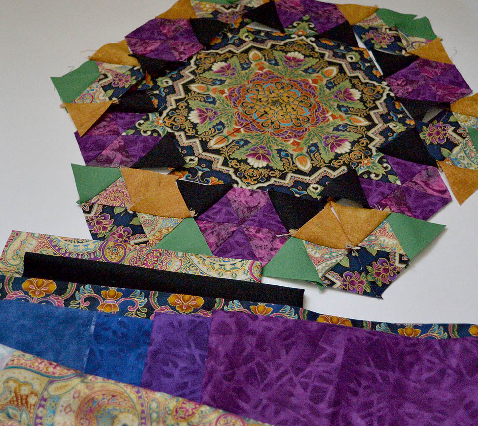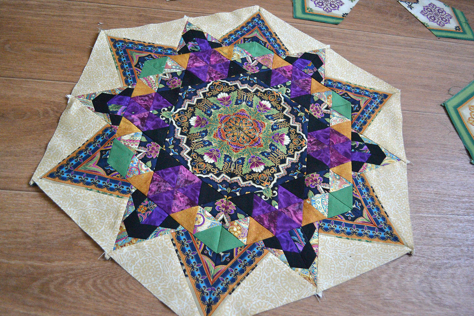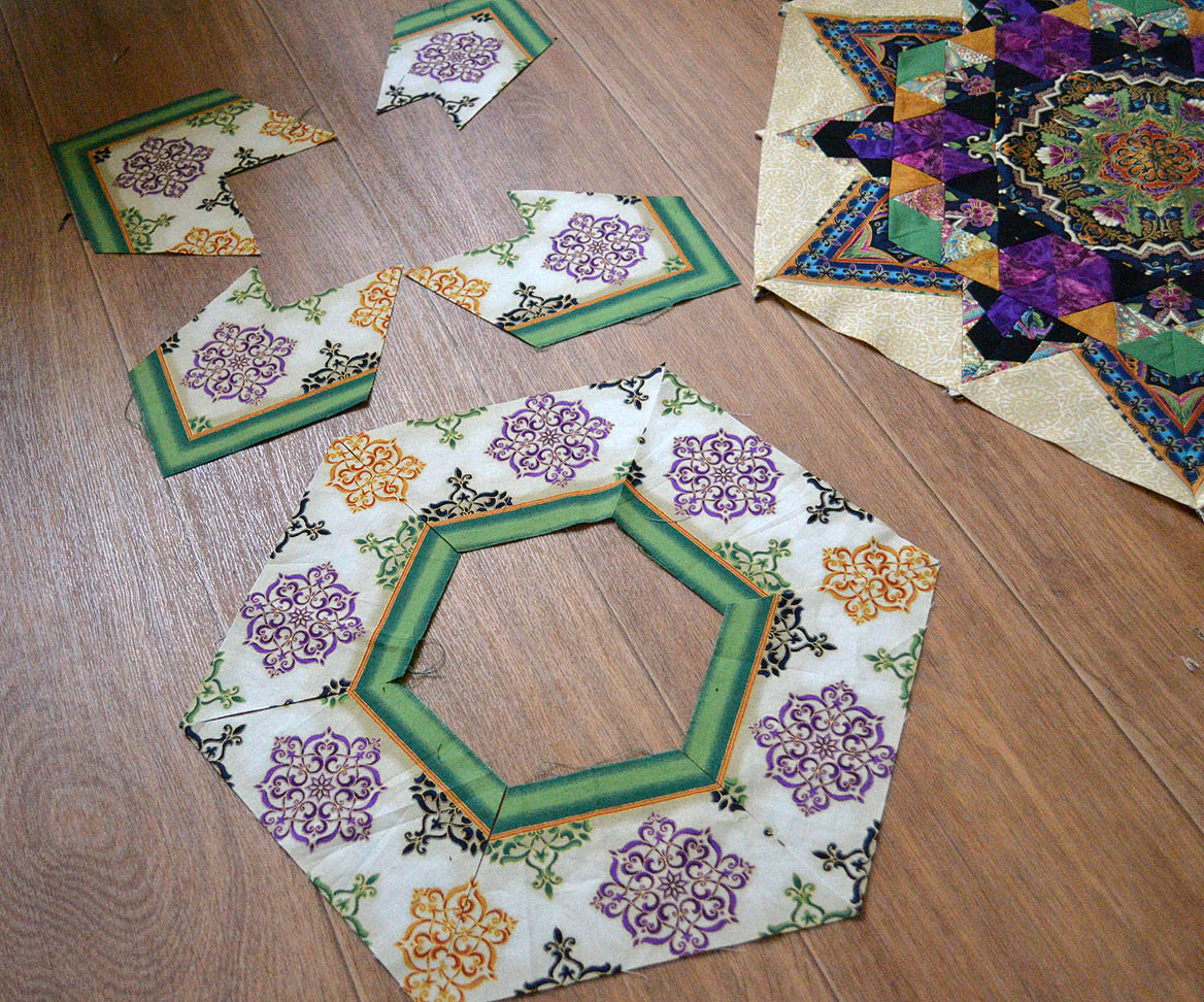 В ход пошли все части панели: и рамка, и бордюр, и все уголочки (вот, что значит качественный дизайн ткани для пэчворка - расходуется полностью)..
