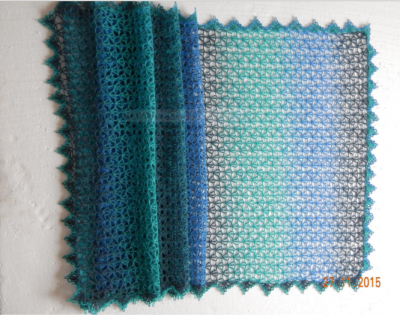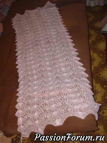 Ниточки: Кид мохер Alize. Три моточка по 25 г. От четвертого "отвязала" буквально чуть-чуть, скорее из вредности - не зря же я его купила! Поэтому вес примерно 75 г. Размер... Знаете, я уже подарила этот палантин маме. Но блокировала на пододеяльнике (полуторка), сложенном вдвое по длине. Вот такой размер. Спицы: 3,5.