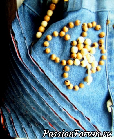 Сумка из старых джинсов ,украсила деревянными бусинками.