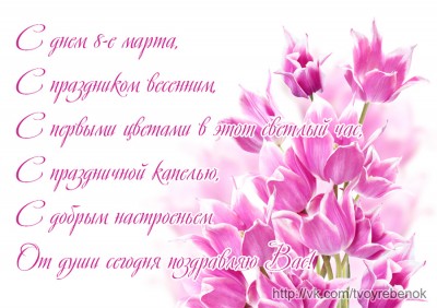 Милые девочки! С наступающим вас праздником. Весеннего вам настроения, новых творческих успехов, вдохновения, интересных идей.Пусть все у вас будет отлично, пусть сбываются ваши мечты.Будьте счастливы