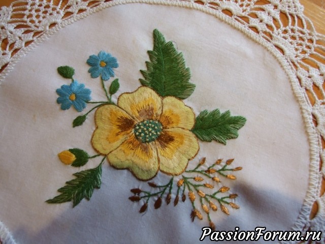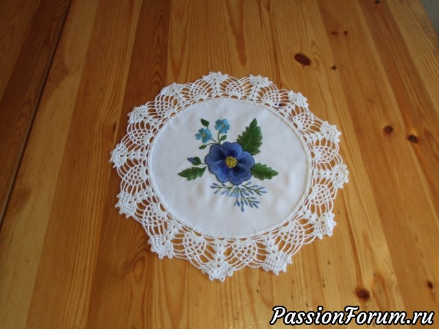 Комплект состоит из четырех салфеток.Ручная вышивка гладью,края отделаны кружевом ручной работы(6 см.).Цветы на салфетках вышиты разным цветом,но все салфетки выглядят гармонично.Великолепный подарок.Диаметр салфеток с кружевом 32 см.Стоимость комплекта 2200 руб.,одна салфетка - 550 руб. Можно покупать поштучно.Оплата наличными при личной встрече (доставка 100 руб.) или предоплатой на карту Сбербанка для других регионов(отправка Почтой России,250 руб.)