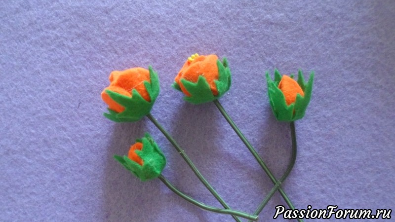 Для бутонов, насадила на веточку чашелистик, остренькие лепестки (склеила попарно). Собрала все в бутоны и склеила клеем.