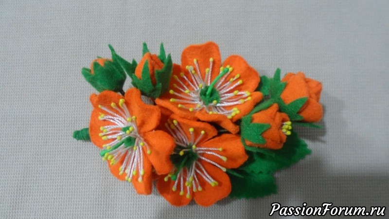 К ней приклеила, бутоны, цветы и листья, лишнюю проволоку обрезала, вклеила булавку.