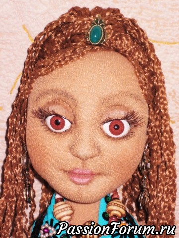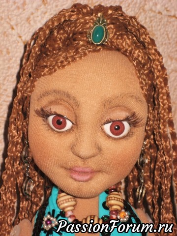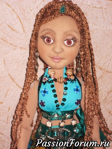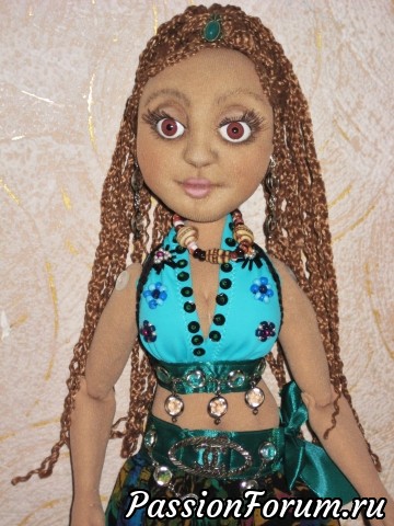 Хочу познакомить вас, дорогие рукодельницы , с новой девушкой. Свою мулаточку назвала Айша. Рост у нее 50 см. Это моя первая шарнирная кукла и наверное поэтому без недостатков не обошлось. Куклу шила из бязи, обтягивала трикотажем. Стоять самостоятельно мы не можем, только на подставке, зато можем сидеть, двигать ручками и ножками, сгибать коленочки и локоточки. Личико объемное, глазки кукольные рыбки, реснички кукольные приклеины, прическа зафиксирована не меняется, сделана из косичек зи-зи. Думаю, она будет тансовщица. На ней много украшений. Топик расшит бисером и паетками. Одежду можно легко снять. Готова выслушать замечания и предложения. Извиняюсь, что много фото, как-то не смогла выбрать, накидала все.
