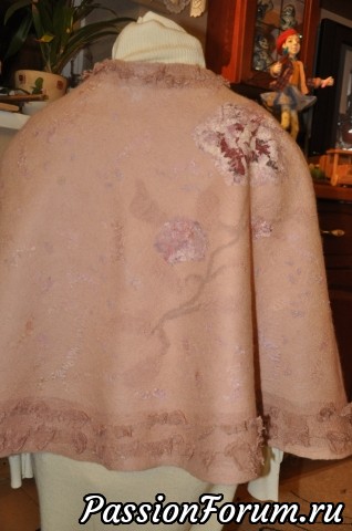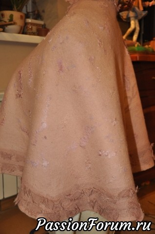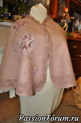 Доброго вам времени суток, дорогие рукодельницы! Я сегодня все думала, что вам еще показать и надумала одну из вещиц с историей. Есть у меня несколько таких, но эта мне больше всех нравится и могу сказать, что это - моя гордость и в каком-то смысле победа))) На Ярмарке Мастеров попалось мне как-то объявление с фотографией потрясающего воображение платьем моего любимого цвета, пыльная роза. Свадебным. Заказчица хотела к нему накидушку на плечи, т.к. свадьба намечалась на прохладное время года. У меня был в наличии такого же цвета итальянский меринос и я предложила свои услуги. Предложений услуг у невесты было множество. Мы стали с ней переписываться и она сказала мне, что хочет что-то типа пиджака или болеро. Платье, на мой взгляд не подходило для этого вида дополнения, мне виделось там что-то летящее, свободное, вроде облачка. Я ей высказала свое мнение и предложила поискать другого мастера или вообще обратиться к портнихе, т.к. валяная одежда, к тому же в облипку, будет сковывать движения, а свадьба - это не подиум, где прошелся взад-вперед и все.