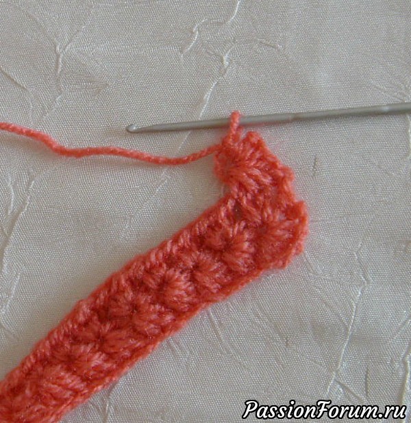 2 ряд. (изнанка) 2 ВП,* ПССН в дырочку над каждой ракушкой*1 ПССН в последнюю петлю 1-го ряда.