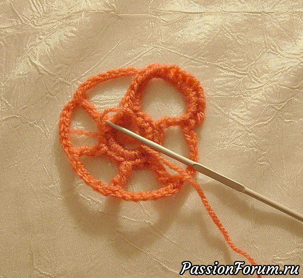 *Снова набираем на крючок 5 петель.Набор начинаем с образовавшейся дырочки над 6-ью петлями,провязанными вместе.