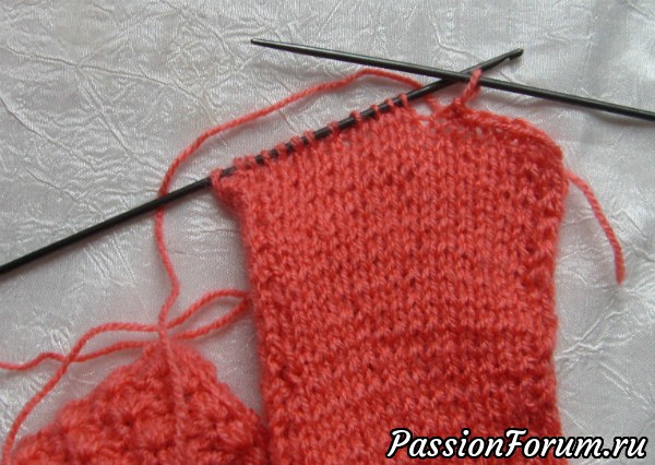1 ряд лицевые петли,2 ряд изнаночные петли.Вязание спицами сразу соединяла с основной деталью .