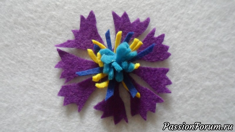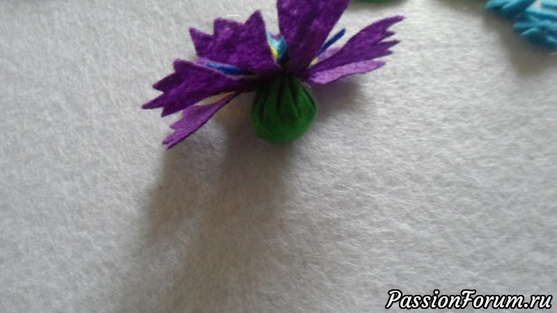 Цветы: зеленые кружки наметала по кругу, стянула нитку, вложив вовнутрь наполнитель и приклеила к лепесткам. В середину цветка по кругу наклеила длинные полосочки синего и желтого фетра, а сверху короткие голубые.