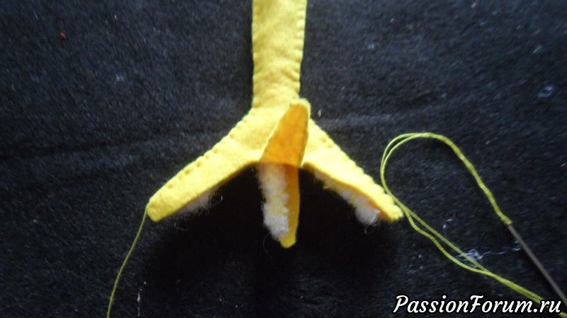 Тушку сшила, оставив сзади отверстие для перьев. Плотно набила синтепоном.