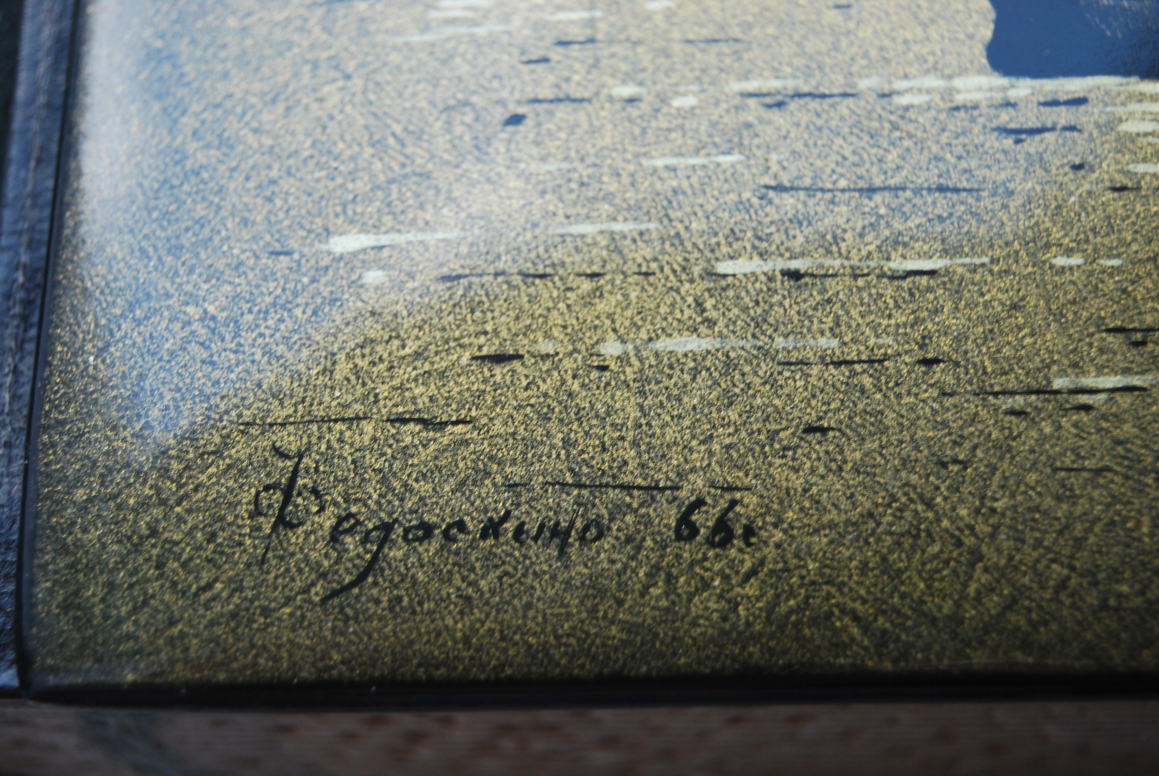 А потом федоскинской фабрике, пожаловали право ставить клеймо – герб Российской империи – двуглавого орла, — но! — только после того, как салонный стиль росписи поменялся на народные сюжеты. Cмекаете..? Федоскино стало поставщиком Императорского двора. А означало это почёт и уважение. Но и качество соответственно требовало.