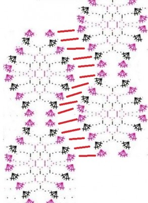 В Paint изменила рисунок ананасы, другими программками пользоваться не умею. Думаю понятно: элементы, соединенные красными полосками, вязать один раз — это одна и та же полоса(два рисунка друг на друга не накладываются без стирания)