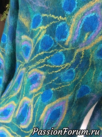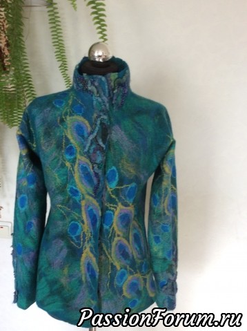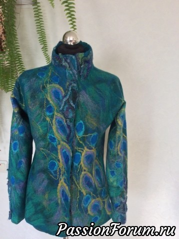 Добрый вечер!Вот свалялся новый жакетик,нежно люблю декор под павлина.Свалян на марле,шерсть 18 меринос,декор шелк и вискоза,перья выкладывала из префельта.На рукавах и воротнику выложены листики из шелка и шерсти,по мк М .Власенко,потом расшито бисером