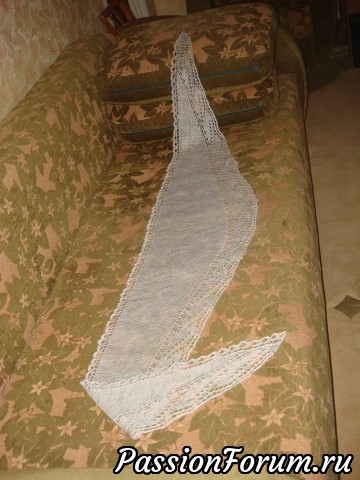 Блокировала на иголочках, но поскольку процент акрила в ниточке достаточно высокий, для надежности, когда косынка была еще влажная на блокировке, прошлась по ней утюгом.
