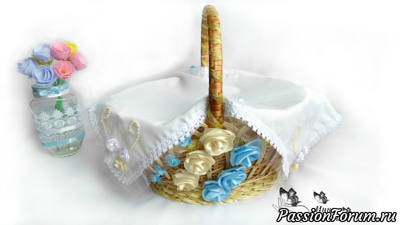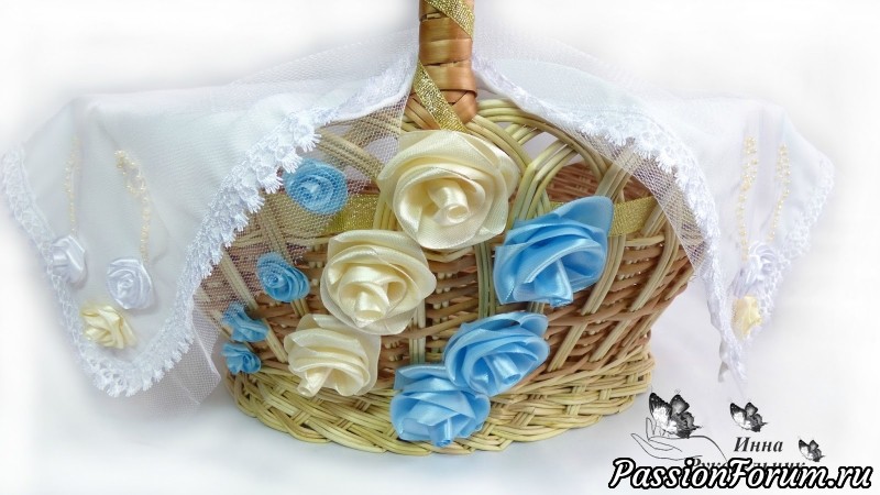 В том году украшала корзинку розами из атласных лент и лентами, а ещё сшила покрывало.