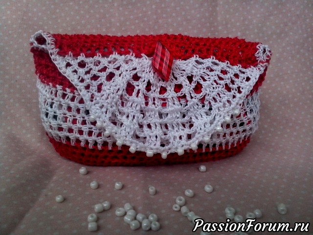 Далее вяжем крючком наш клатчик, который будет служить одновременно и внутренним карманчиком. Схема простая - столбики с 1 накидом( фото 4) Вяжем до нужных вам размеров, примеряем чтобы сумочка поместилась. Далее вяжем клапан сумочки и украшаем ее бисером, пришиваем пуговицу (фото 5).
