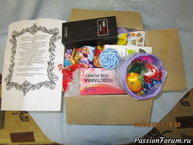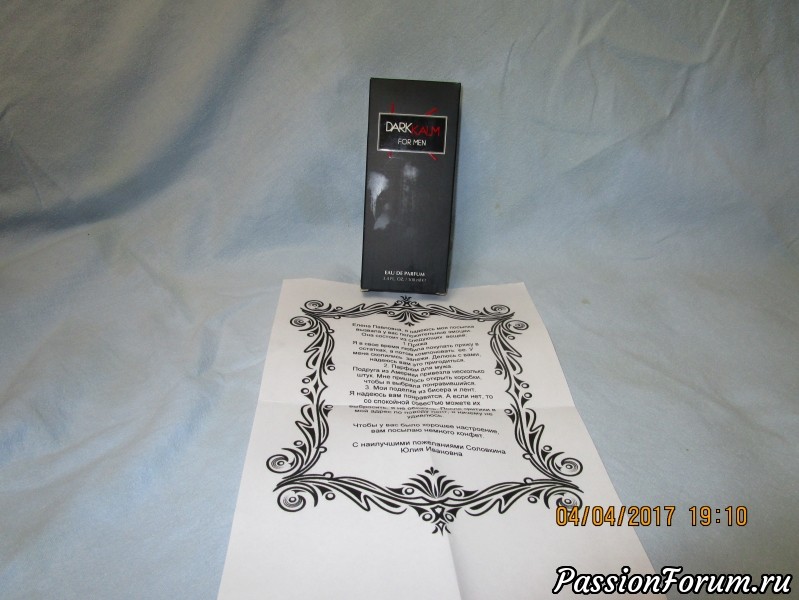 Письмо от Юлии Ивановны, в котором она написала, что данная коробочка с туалетной водой в подарок моему мужу. Запах, скажу я вам девочки, великолепный. Юлия Ивановна, Виктор передает Вам огромнейшее спасибо!!
