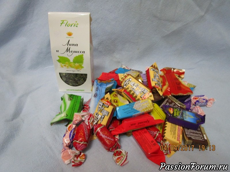 Замечательный лечебный чай с липой и мелиссой и гора конфет. Муж мой успел простудиться на даче - напою его лечебным чаем.