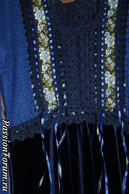 Вставки крючком связаны из пряжи Violet100% мерсеризованный хлопок, 282 м, 50 гр., ушло около 50г, использованы атласные тонкие ленты и жаккардовая тесьма. Юбка из темно синего велюра от платья 20-летней давности