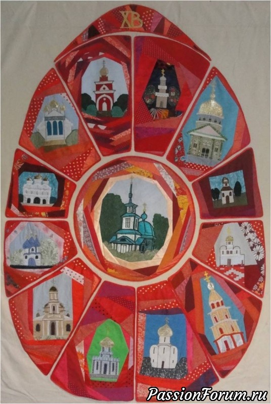 А так, я принимала участие в коллективной работе. Панно «Пасхальное яйцо» в размерах огромное, столько времени у нас на него ушло. Сначала начертили эти огромные размеры, разделили между собой на блоки. И вот каждый делал свой блок – церковь. Затем в общее панно собирали готовые изделия. Нам соорудили огромный стол, и целую неделю соединяли пазлы воедино. Здесь это панно не бросается в глаза. Но когда приходишь на выставку, то не можешь оторвать взгляда от Пасхального яйца.