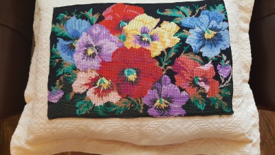 Много лет назад я у нее из запасов забрала себе вышивку. Это был "подзор" на кровать. Вышивка крестом, причем очень крупным, я думаю, что в 6 нитей. Это был кусок ткани, длиной чуть меньше 2 метров. Но почему нижний край был не подшит. Работа от старости была уже вся в желтых пятнах. Пробовала пятна отстирать, но ничего не вышло, пятна "вжились" в ткань. Так и лежала эта вышивка у меня очень давно.