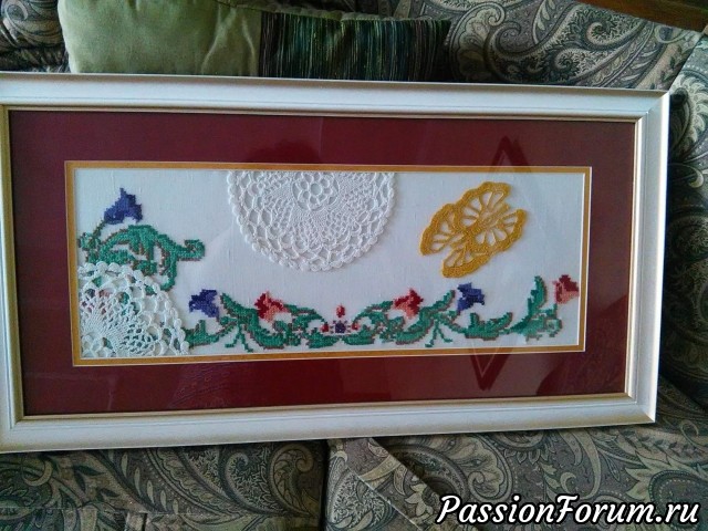 У мамы трое внуков. Мысленно разделила "подзор" на три части (на память от бабушки каждому из внуков). Взяла с собой салфетки, связанные мамой крючком еще в 80-тые годы прошлого века, желтые бабочки (новодел) и пошла в багетную мастерскую.