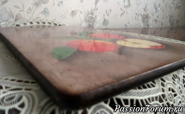 Добрый день ! Посмотрев МК Алевтины Заричной захотелось сделать досочку. Кто смотрел, тот помнит какие у нее красивые получаются. Она работает с замедлителем красок. У меня был " Таир ". Она про него говорила, что с ним работать плохо. Решила испытать. Ее слова- правда. Он липкий и тянет за собой краску. Поэтому пришлось смыть , но доделать уже хотелось. Салфетка, тени, фон и лакировка.