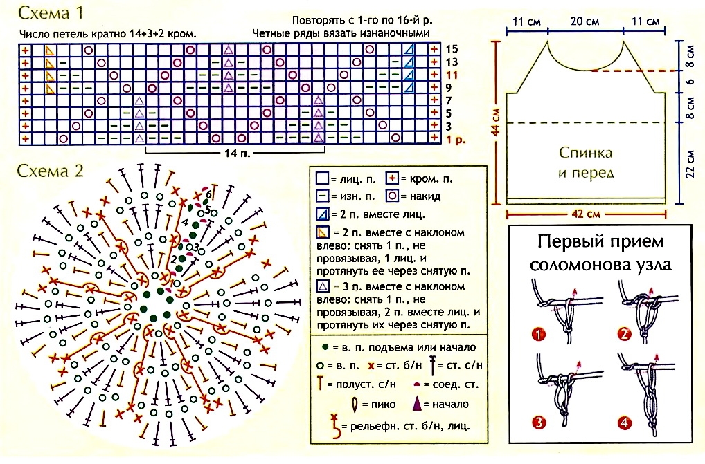 Обвязать проймы и бретели 3 р. ст. б/н по кругу, начиная каждый р. 1 в. п. подъема и замыкая соед. ст. Обвязать проймы, бретели и вырез горловины, выполняя первый прием соломонова узла (см. рис.), провязывая 1 ст. б/н и пропуская 2 п. нижнего р. Связать 5 цветочков по схеме 2 и пришить их к переду по линии перехода узоров.