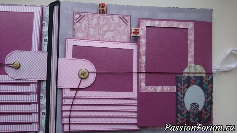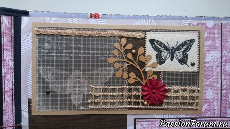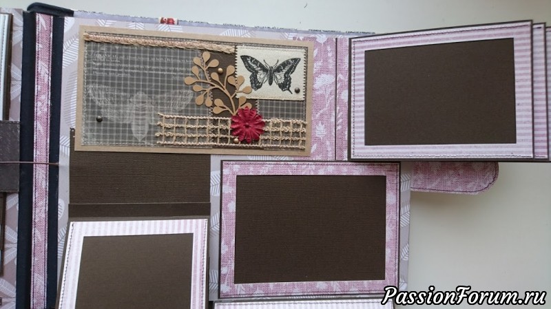 Корочка матерчатая. Декором минимальный. Фотографий одной страницы будет несколько, чтобы показать размещение подложек для фото и декора. Декор, в основном, под фотографиями.