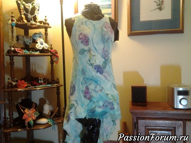 Привет всем рукодельницам! Всех с прошедшей Пасхой! Ура, я сваляла сарафанчик для себя и " выгуляля" его на празднике. Образец делала из 2й разрежанной марли с тонюсеньким внутренним слоем 18 микронного мериноса и с верху на марле разные волокна шёлка. Усадка получилась разной : поперёк-1.4, а вдоль -1,6. Сарафан решила сделать со средним результатом 1,5 и в один слой марли. Марля зарание окрашена. На внутреннюю сторону добавила шёлка и вискозы ( вместо марли). Получилось очень мягко и межно к телу. На весь сарафан ушло : шерсть 18 мик. меринос -96 гр., шёлк и вискоза 25 гр., марля разреженная - 7 метров. Вес всего сарафанчика 272 гр.