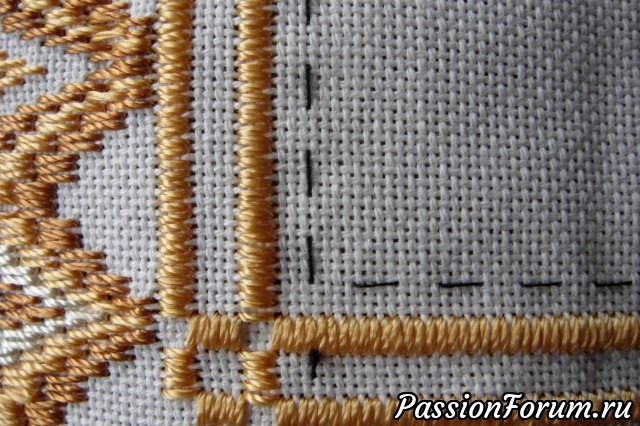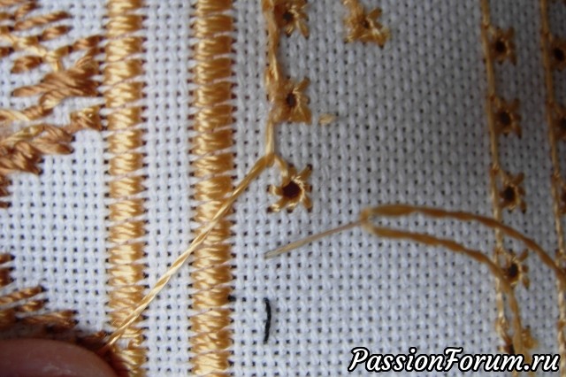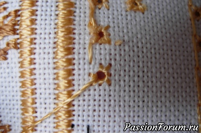 Вышив ряд глазков получила неприятный сюрприз - не хватило двух ниточек, что бы выполнить последний глазок. Видимо из-за того, что я изменила размер салфетки, увеличив ее на несколько уголков, количество ниточек оказалось не кратным 4. Пришлось распарывать весь ряд. Ох, скажу я вам, нелегкая это работа - "выковыривать" хорошо затянутые и прихваченные клеем глазки. Поэтому, мои дорогие, не берите с меня пример, не ленитесь делать метки.