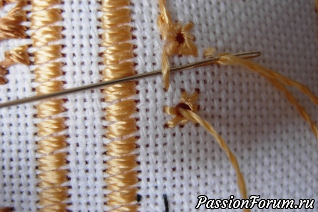 таким образом строчка образуется над рядом глазков. Не знаю, может быть я изобрела велосипед, или есть более простой способ заполнения фона алжирскими глазками. Кто знает - поделитесь, пожалуйста. Нам, рукодельницам,очень нужен обмен премудростями))))