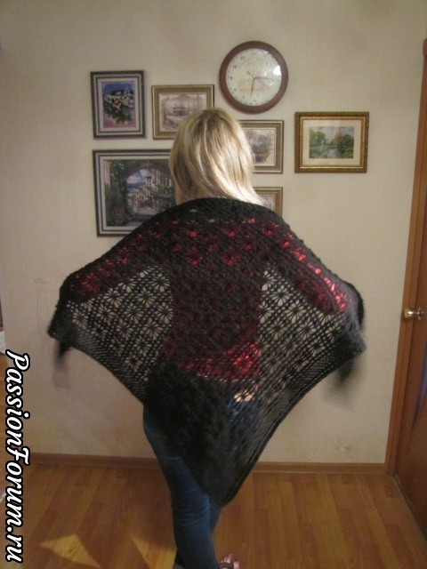 Красивая уютная шаль. Не думала, что чёрная так хорошо смотрится. Только я бы ещё кисти довязала. Законченный вид приобрела бы шалочка. Извините, ели обидела.