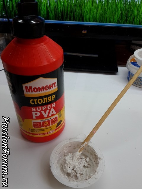 У меня шпаклевка немного загустела, поэтому добавляю чуть-чуть клея ПВА