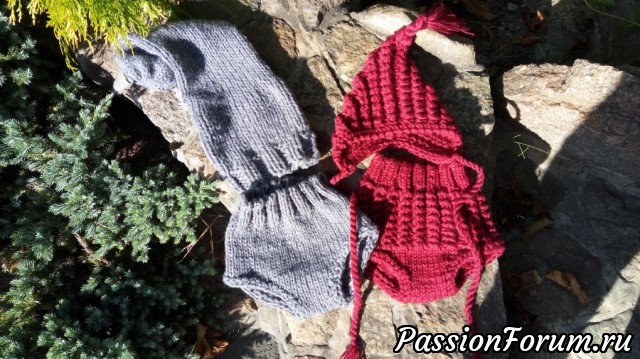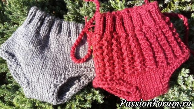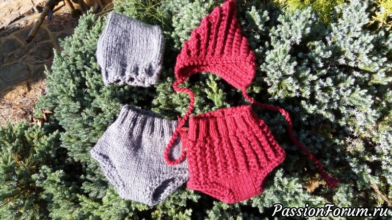 Трусики вязала по кругу, без единого шва, заказчице всё понравилось, а особенно бордовая шапочка, они потом попросили к ней связать шарфик и зимой носили комплектом, только вот шарфик я не сфотографировала. И напопники тоже зимой носили поверх памперсов.